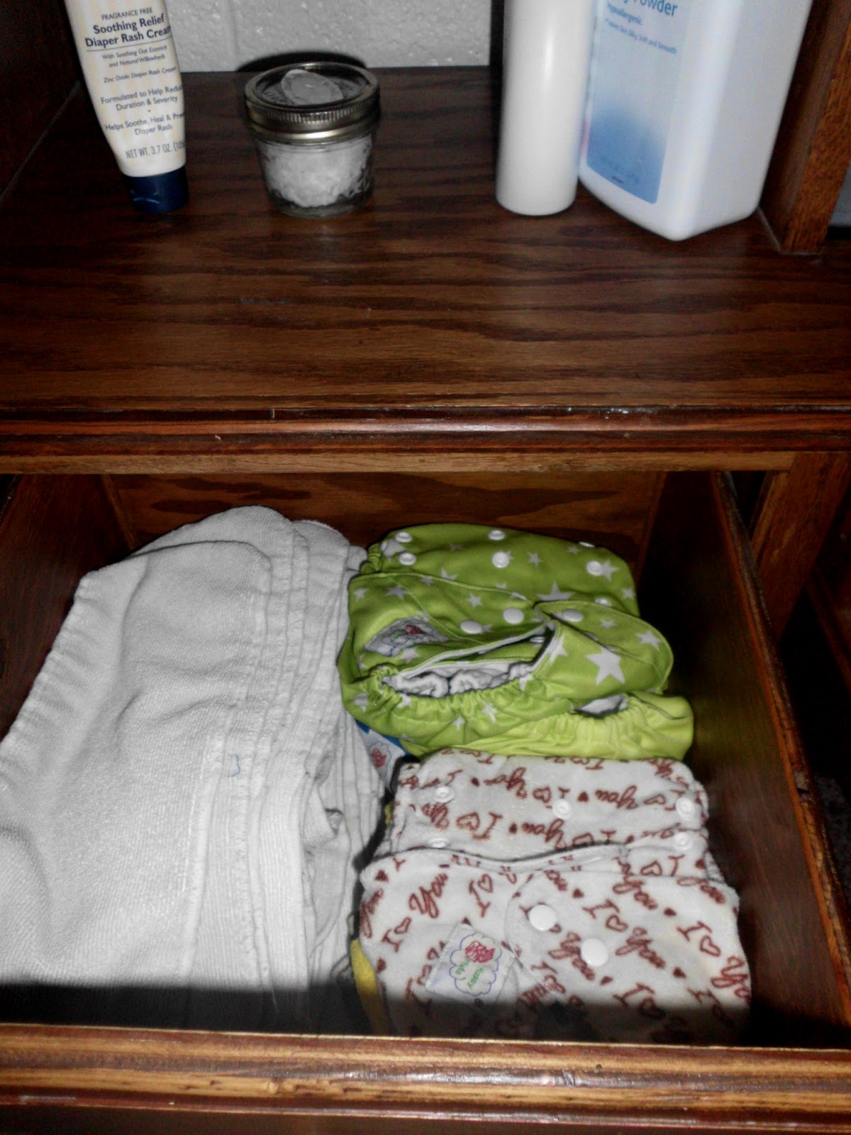 Cloth diapers are not that much harder in my mind than disposables. I keep my diapers in a drawer in my sons room with the diaper pail and a garbage can. When changing time comes I take baby to the room, remove his diaper, take out the insert and throw both the cover and insert into the diaper pail and replace the lid. If I’m using cloth wipes they go in the diaper pail as well. If I’m using disposable wipes they go into the garbage. I take a diaper from the drawer with an insert already in and put it on baby. If I’m getting baby ready for night I will usually double up on the inserts so that the diaper lasts longer through the night. I have 20 cloth diapers and 40 inserts so they usually last anywhere from 2 to 3 days before it is time to wash.
